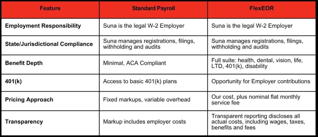 Suna makes it simple. Whether you need basic payroll support or a full service FlexEOR solution, we handle the administrative burden so you can focus on the work.